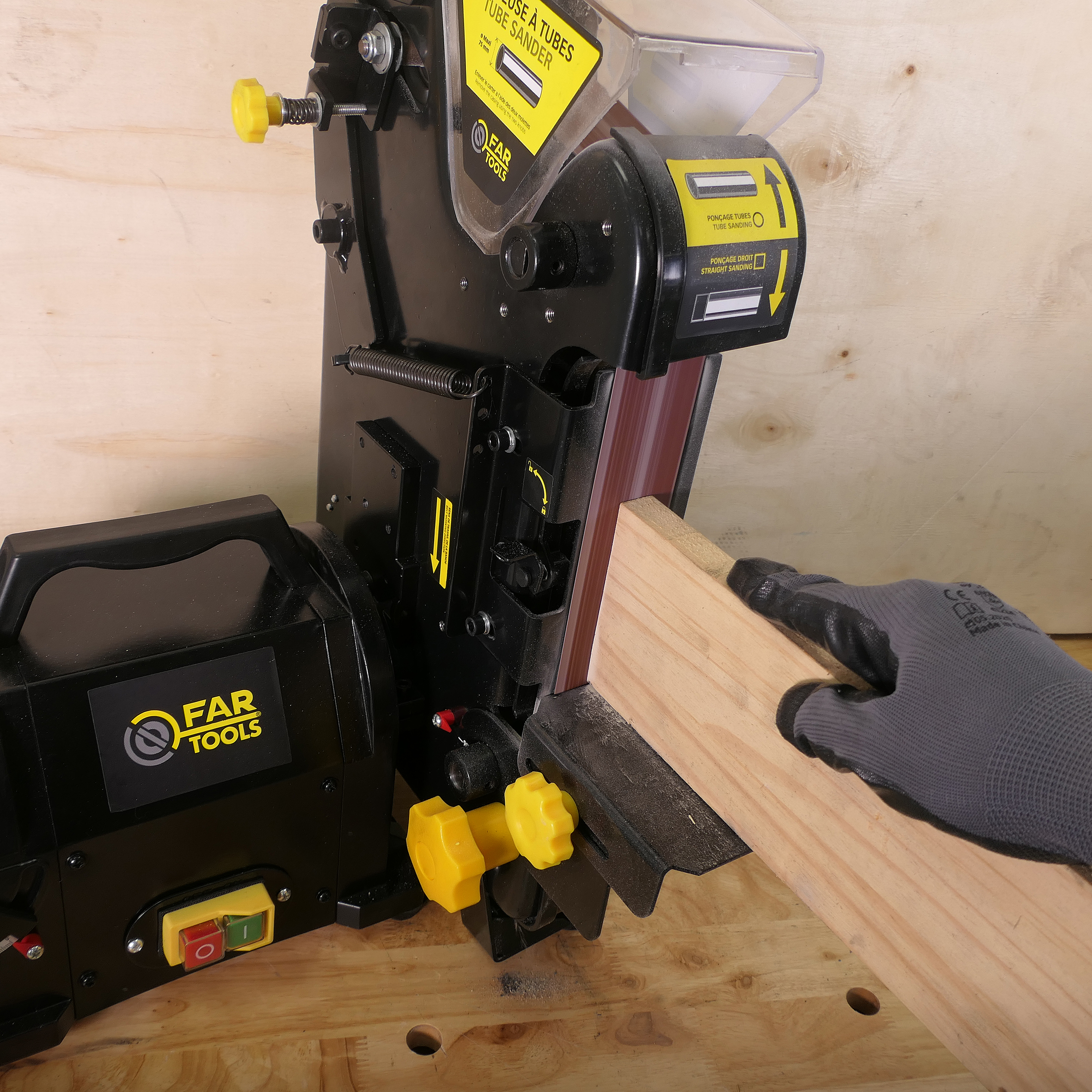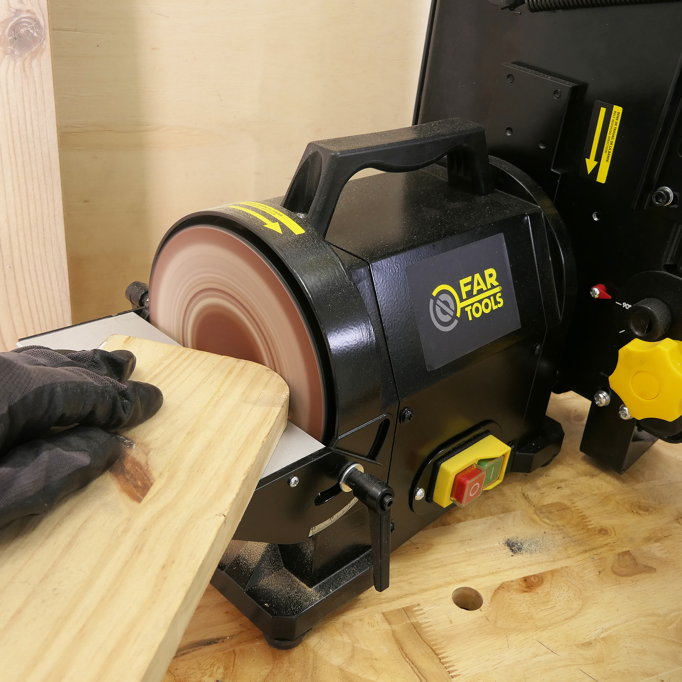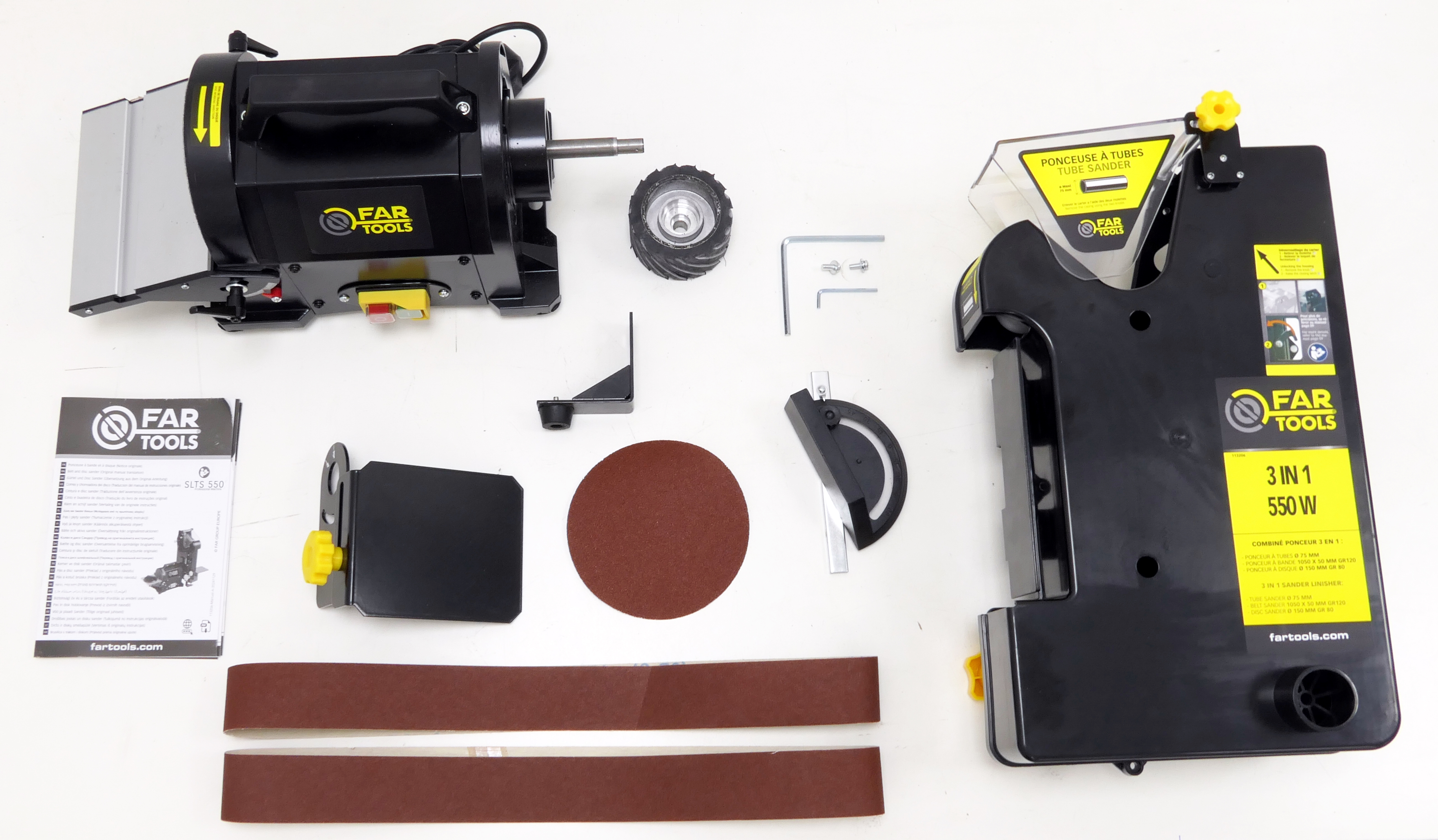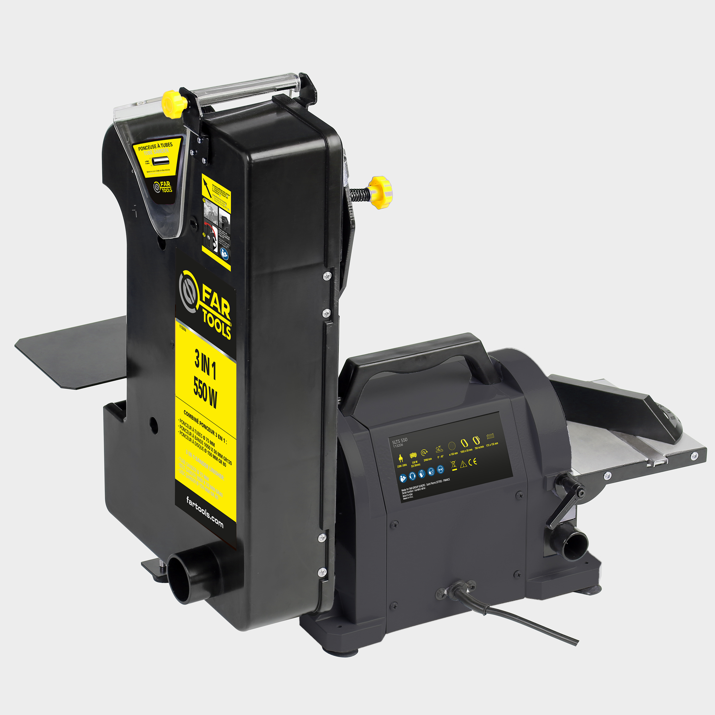 Combiné ponceur 3-en-1 (bande, disque, tubes) 550 W, avec table inclinable 45°, disque auto-agrippant, tension auto de la bande et double aspiration.