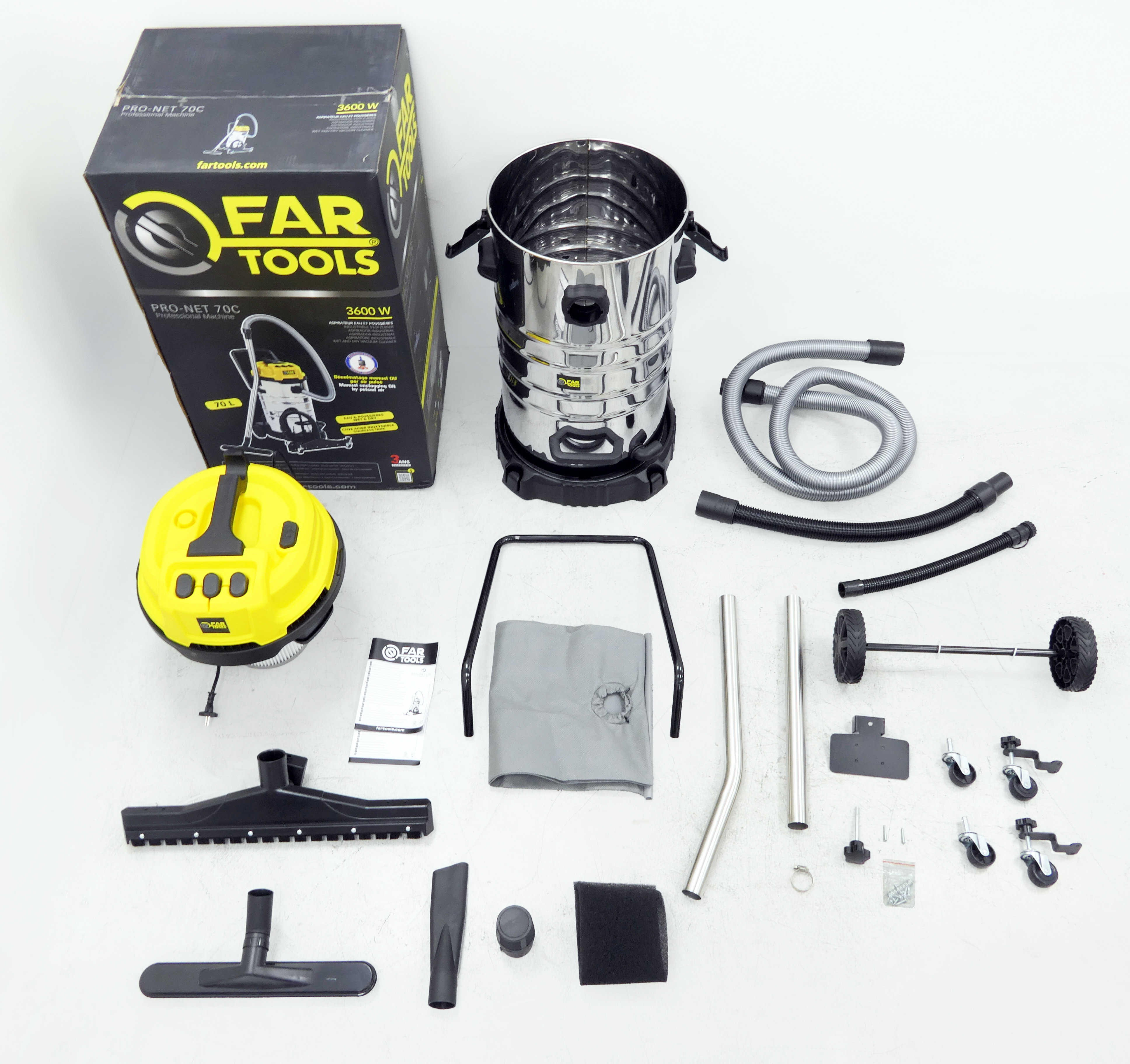 L'aspirateur Fartools PRO NET70C est livré de série avec son chassis sur roulettes directionnelles et avec son suceur large (550mm) pour traiter les grandes surfaces au sol. Il dispose également d'un filtre cartouche et d'un filtre toile. Afin d'aspirer les liquides, il est livré également avec un filtre mousse. Son flexible de ø38mm et de longueur 3 m permettra de s'adapter aux différentes conditions.