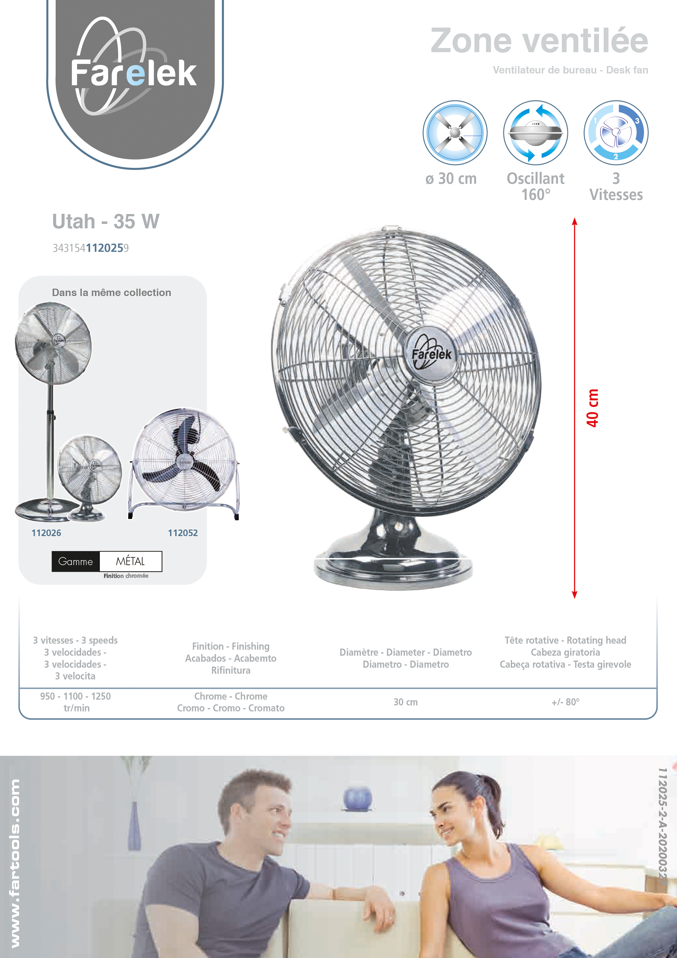 Posé sur bureau ou table, orientable, diamètre 300mm et d'une puisssance de 35W, il rafraichit une pièce. 3 vitesses de débit d'air. Design singulier et finition métal chromé en font un produit esthétique qui se fond dans tous les décors.