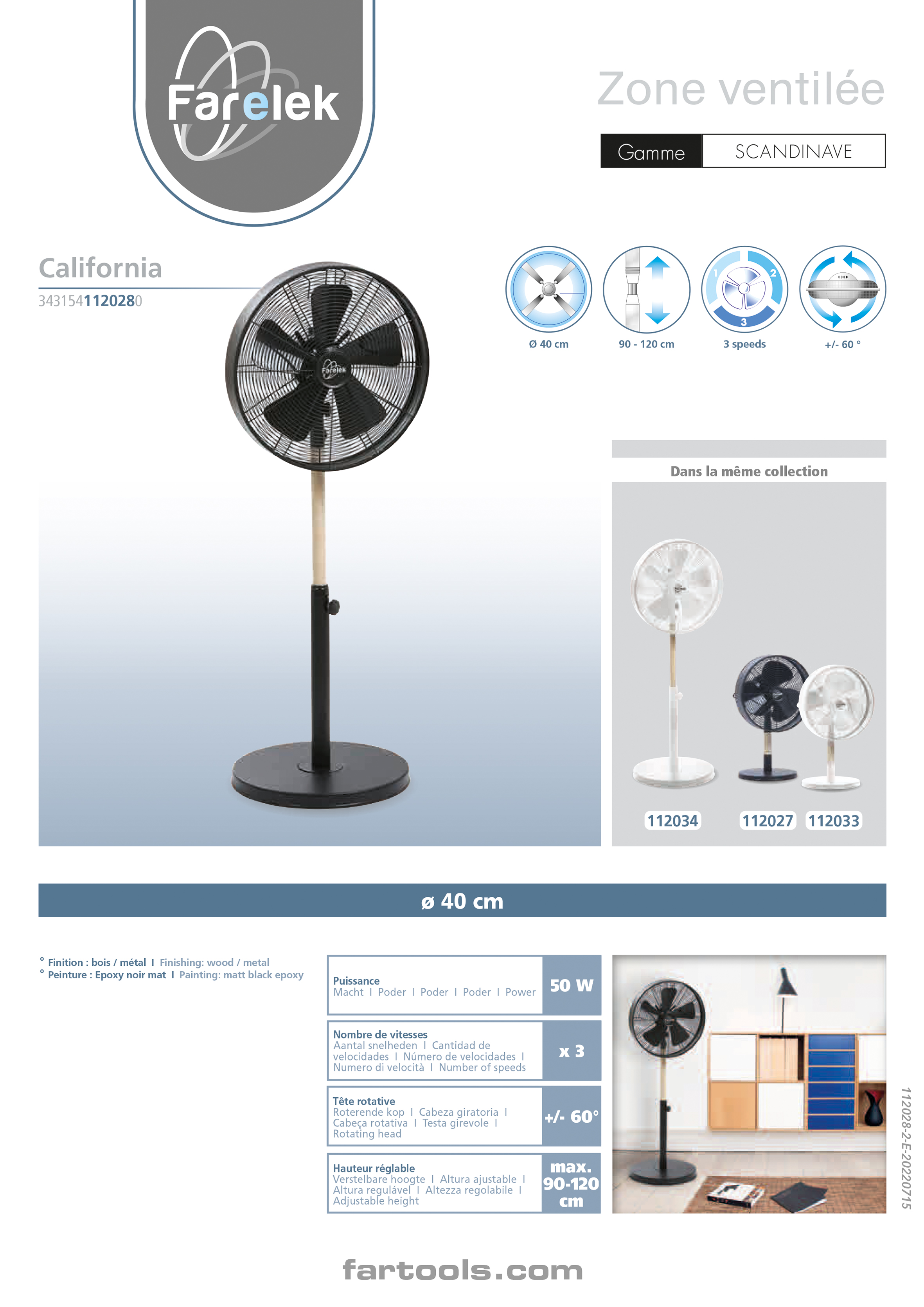 Sur pied, il est orientable et ajustable.De bon diamètre (400mm) et suffisamment puissant (50W), il rafraichit une pièce. Sélecteur 3 vitesses de lame pour moduler le débit d'air. Son support est réglable en hauteur de 90cm à 125cm.